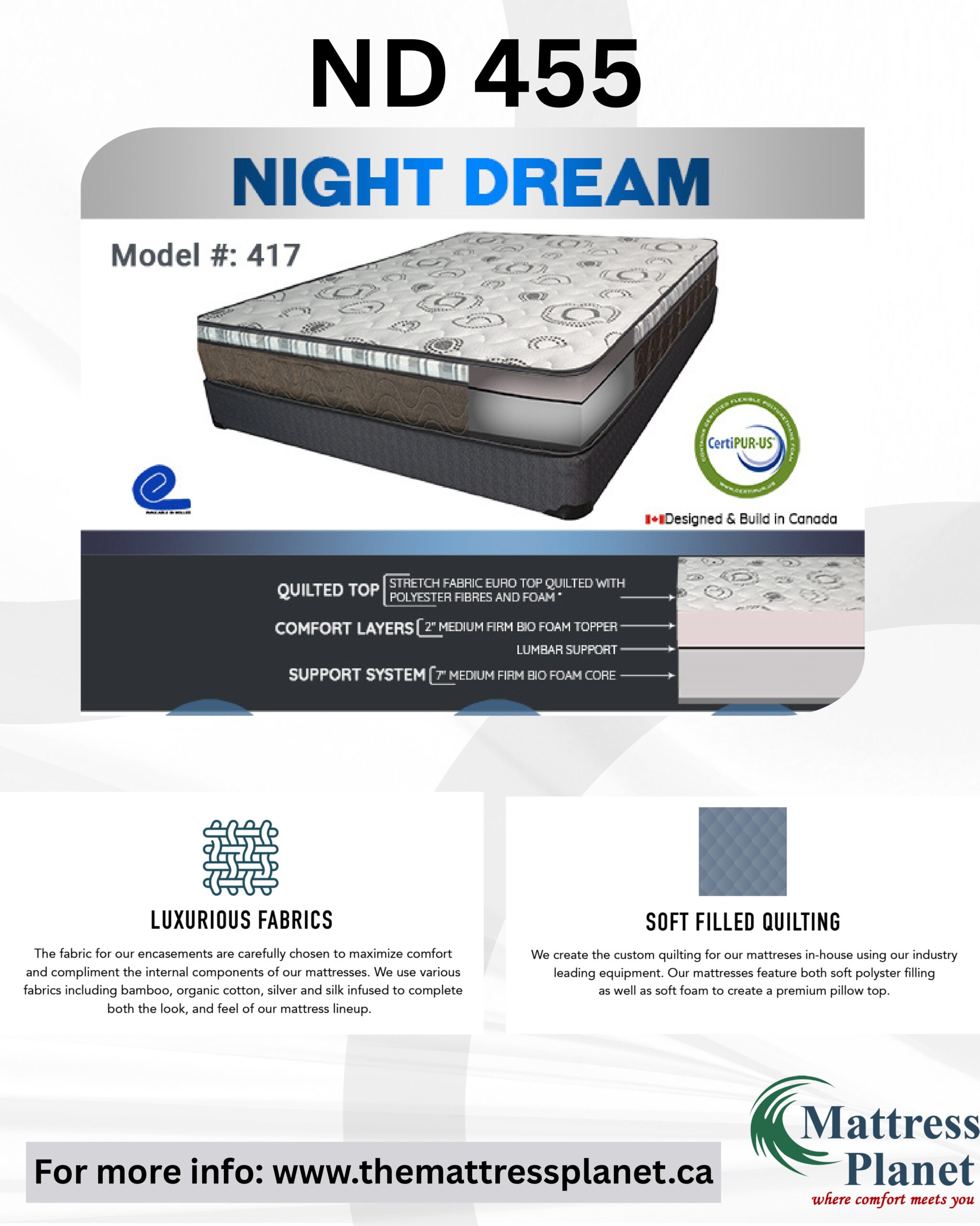 - Quilted top : Stretch fabric euro top quilted with polyester fibres and foam “